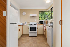 The kitchen has a free standing oven, range hood, compact dishwasher, and pantry, it overlooks the back covered deck and rear terraced garden, which has room for tents at the Christmas overflow of family and friends. A sheltered area perfect for the bbq as the family gathers around with a drink after a day of activities. Just off the kitchen is a separate laundry and along the hallway is a separate toilet, a newly renovated bathroom complete with a shower over the bath and stylish vanity.
