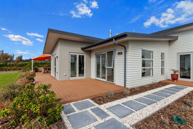 Built in 2013, the north facing open plan living and dining area centres around a well-planned kitchen, complete with island bench, gas cooking and walk-in scullery. From this central hub the separate lounge and triple garage (with third toilet) can be accessed. Interior comfort is created with a low-emission wood fire, heat pump and heat transfer system. The sunny master bedroom includes an ensuite and walk-in wardrobe, and the master bathroom features a stand-alone bath.
